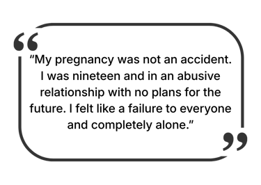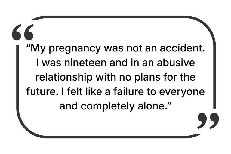 “My pregnancy was not an accident. I was nineteen and in an abusive relationship with no plans for the future. I felt like a failure to everyone and completely alone. I thought having a baby would do two things: make him love and respect me more, and make me a hero in someone’s eyes.